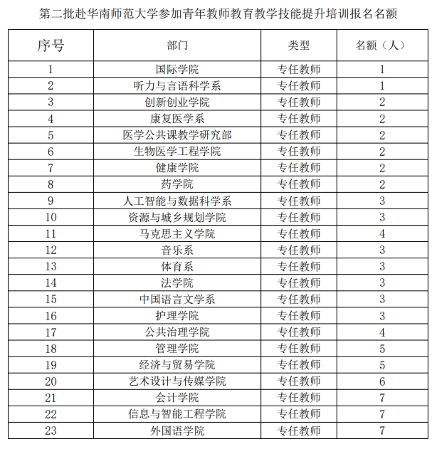 本次培训原则上主要面向年龄为45岁及以下的青年教师,其中职称为助教的教师必须参加,第二批名单由各二级教学单位推荐报名,具体名额见附件报名表。