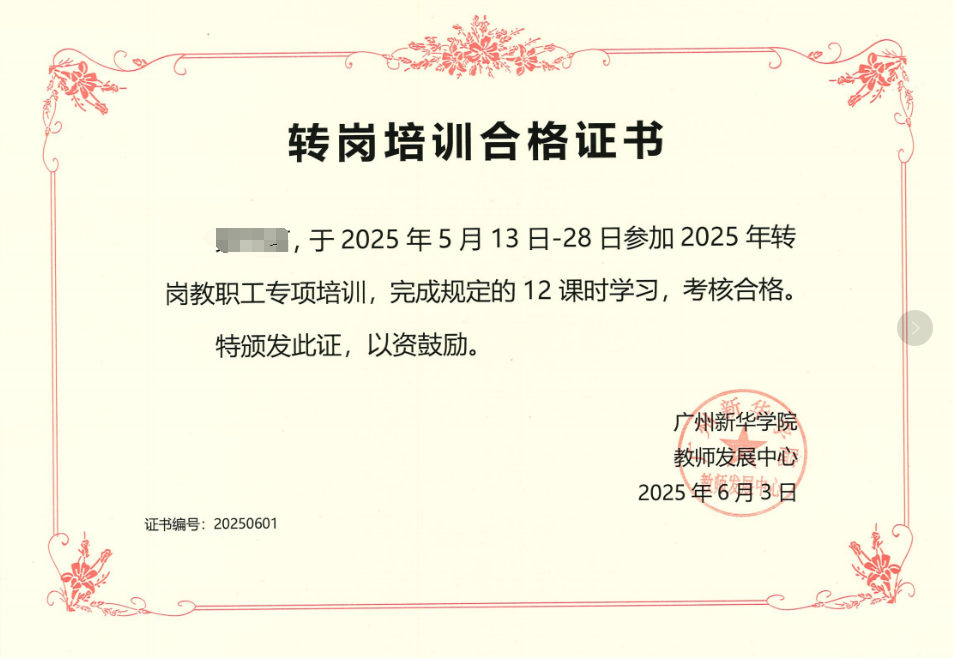经过一段时间的紧张学习,所有参训人员均在规定时间内完成了规定的学时。其中,转为教师岗位的人员还按照要求提交了不少于1000字的学习心得。这些学习心得不仅记录了学员们在培训中的收获与感悟,更展现了他们对新岗位的热情与期待。最终,考核达标者由太阳成集团tyc151cc颁发了“转岗培训合格证书”,为本次培训画上了圆满的句号。