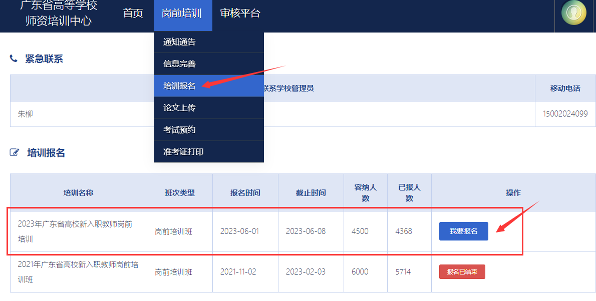 第四步:报名:进入系统后“岗前培训----培训报名----我要报名(2023年广东省高校....)----选择1、2项(2023年两学课程)---确认报名”完成报名,后续等待管理员审核报即可。(只选择“1.高等教育学,2.高等教育心理学”两项进行报名)如图: